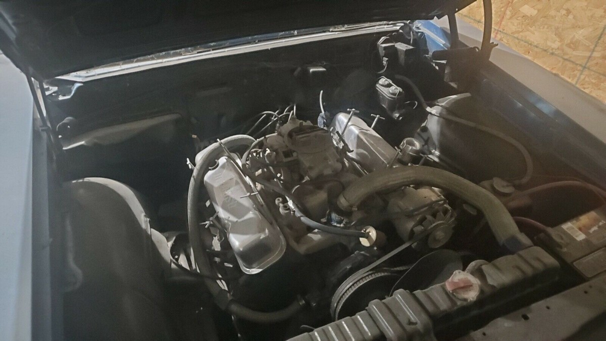 The engine has been modified for more performance. It has a dual feed, vacuum secondary Holley carb and an aluminum intake manifold. It also has Moroso valve covers, those and the wheels, Cragar SST’s were popular in the late-70’s to mid-80’s.