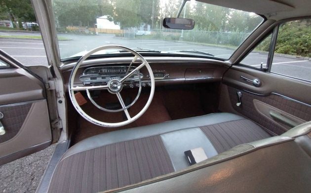 The Champagne paint looks great, and it’s said to be original, other than a couple of areas that were touched up by the current owner. That always brings up the question of whether a vehicle can be a survivor if it’s had some of the original paint touched up? Not to mention, had the engine rebuilt, a new gas tank, had new carpet installed, and the front bench seat reupholstered, etc.? I say yes, those things can be argued to be maintenance, even rebuilding the engine. Thoughts?