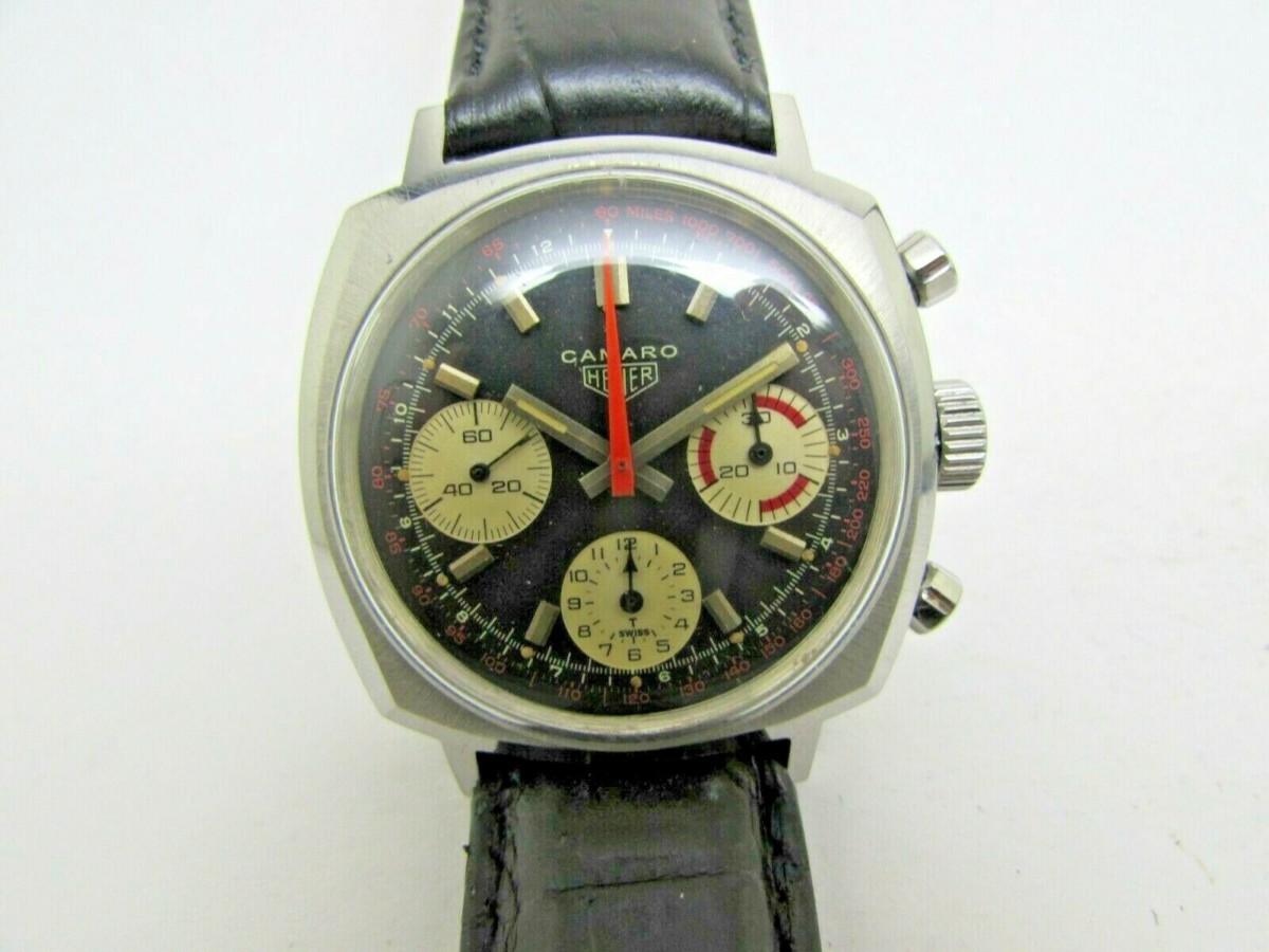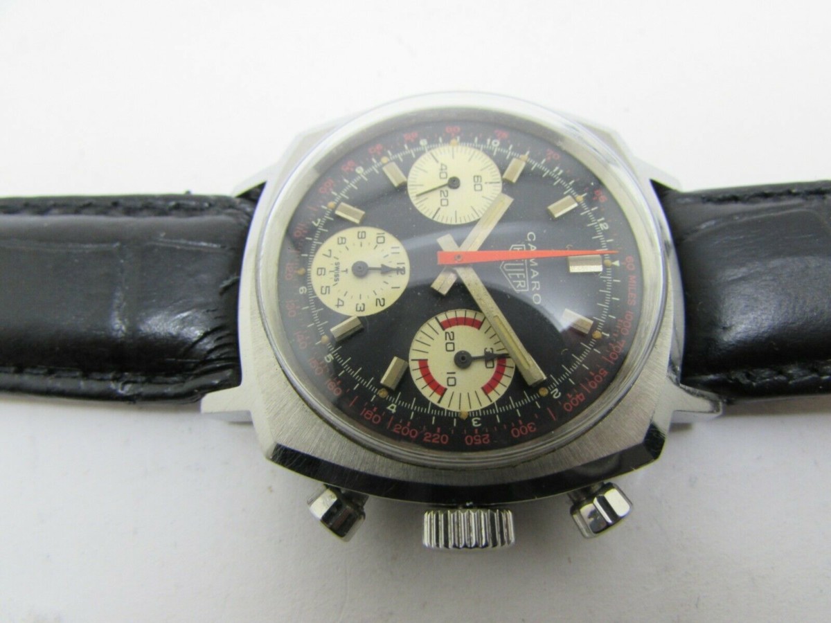 This particular Camaro features the Valjoux 7736 movement, the basis of which is still used today and provides a three sub-register face with, in this case, a white on black dial. I decided to do some research on other Heuer Camaros for sale; they are actually quite rare as production ended in 1972. The average price of used Camaros on the market was in the $4,500 to $5000 range, with some sales ranging as high as $10,000. Which, while still being lower than the average price for a running 1968 Camaro Super Sport (the Chevrolet version) at $27,400, is still a sizeable chunk of change.
