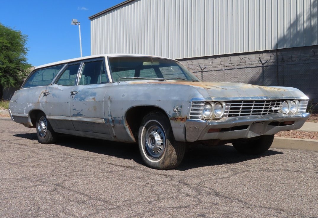 During the fourth generation of the Chevy Impala (1965-70), station wagon production was not documented by series, but by type of engine. Out of 152,100 total wagons Chevrolet built in ’67, 140,700 would have a V8 motor like the seller’s which has a 327 cubic-inch powerplant with a 4-barrel carburetor.