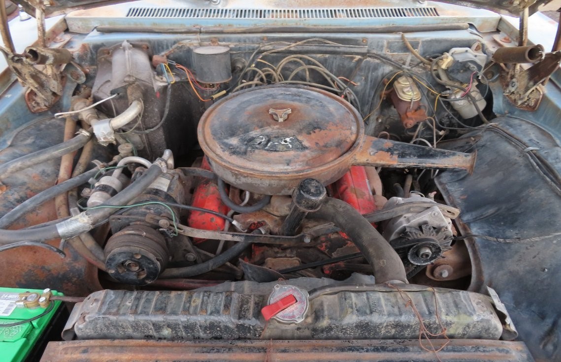 This wagon has the appearance of a long-stored vehicle with much of that being outside. That means it was subject more to damage from the sun rather than water since it’s an Arizona car. The Chevy has been repainted at least once and that two-tone job is faded and flaking away. The body isn’t too bad, although rust is present in the rear quarter panels, floorboards, and a few other places. The chrome is not bad, and the glass looks fine. There isn’t much left of the original interior that won’t need attention. The fact that this is a 3-seat wagon limits the number originally built, but we don’t know by how much.