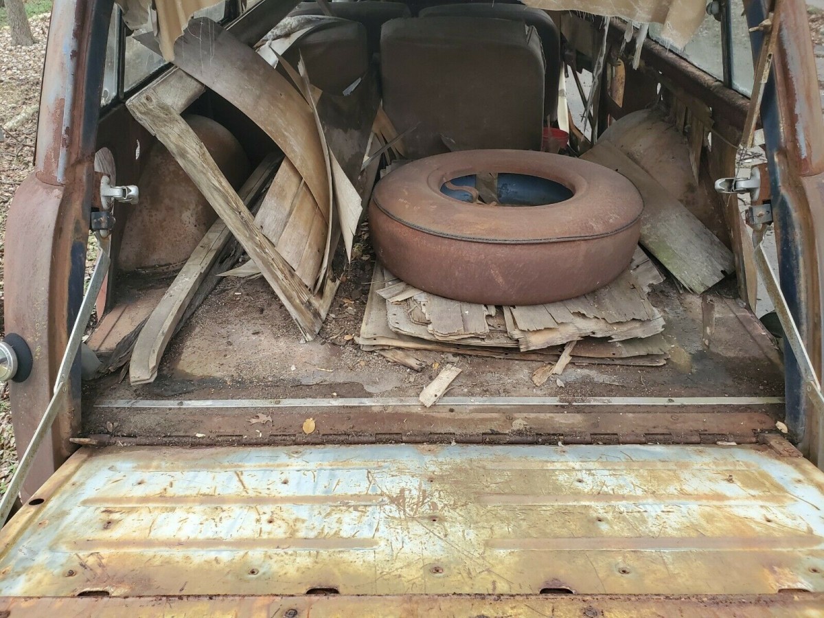 Under the hood should be a 239 cubic inch flathead V8 that was tricked out back in the day. The seller says it has Offenhauser aluminum heads and aluminum intake with twin 2-barrel carburetors. There’s no telling how long ago this engine was last started or what it will take to do so again. The Woodie has both front and rear seats and a spare tire cover which is said to be rare. A lot of odds and ends are piled into the storage area in the back.