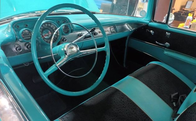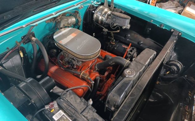 I’ll go out on a limb here by stating that this Bel Air’s interior is the star of the show. The Turquoise and Black trim looks striking and clean, with no evidence of wear. The steel sports the same paint shade as the exterior, the wheel appears excellent, and the bright trim seems flawless. Any potential cosmetic refresh could be limited to this car’s exterior, as the interior needs nothing. Creature comforts include a power front seat, power windows, a clock, and a radio.