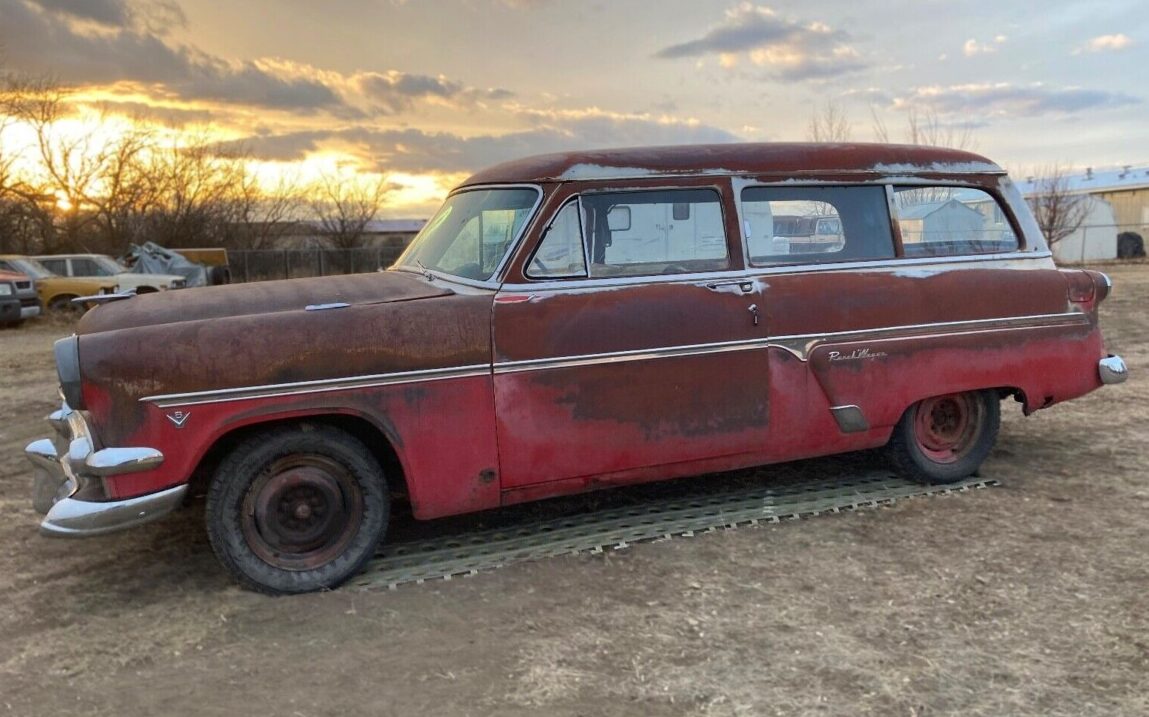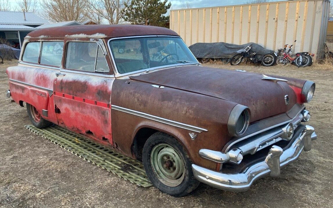 For a design basically absent from the American carscape since the early ’60s, two-door station wagons, such as this 1954 Ford Ranch Wagon, continue to turn up. One of 36K produced, this car has been extensively videoed by the seller and all of his work provides a pretty clear picture of a body style that has become a favorite of hot-rodders and customizers. Let’s look this one over and see what’s here. Located in Great Falls, Montana, this weather-worn wagon is available, here on eBay for a BIN price of $3,000. There is a make-an-offer-option too. Thanks to George for offering this tip!