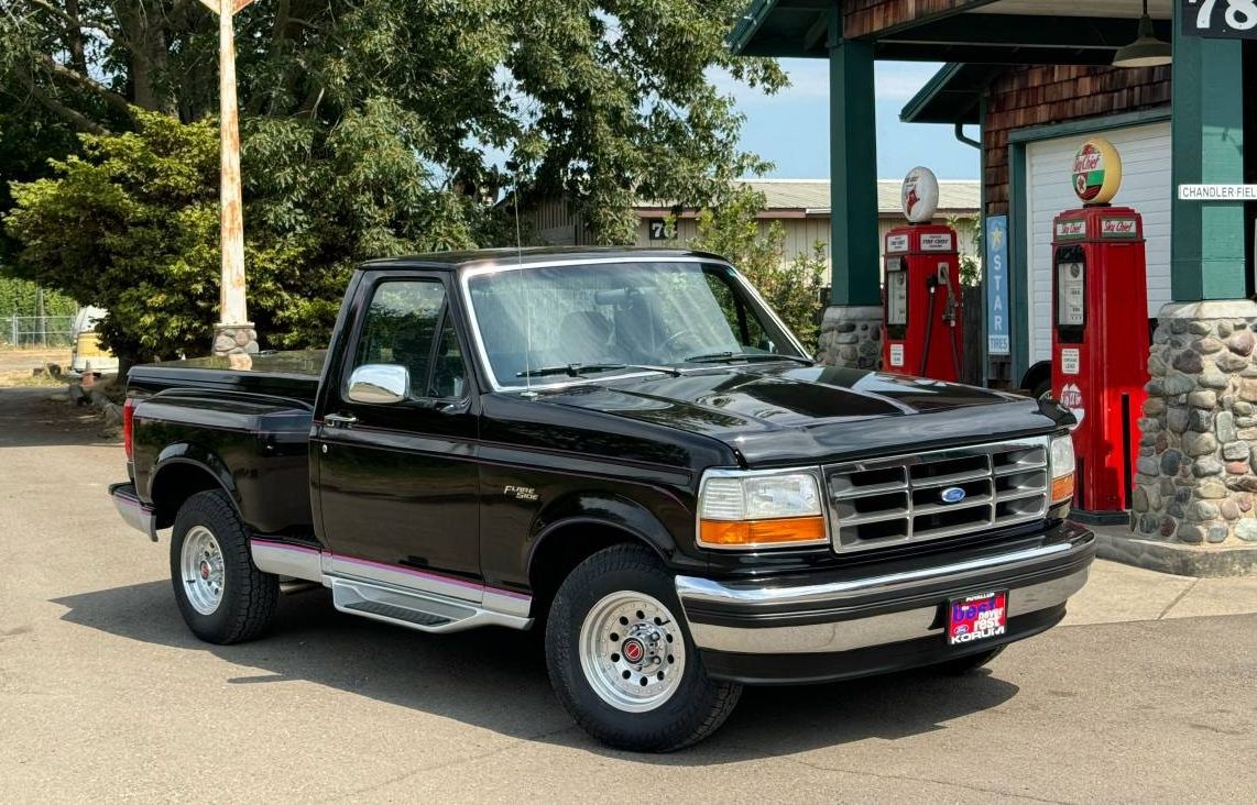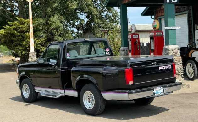 The Ford looks sharp with black paint and a subtle silver two-tone strip running beneath the cab. The aftermarket wheels were a popular choice for F-150s of this era (it may have even been a factory option – feel free to confirm or deny in the comments) and the Flareside bed was the icing on the cake. The fender bump-outs harken back to the 70s when an owner who liked custom touches may have even mounted a spare tire in the space between the back of the cab and the front of the fender. The Flareside design endured, and was used on everything from F-150s to Rangers in the early and middle 90s. This Ford also comes with side steps and a matching tonneau cover.