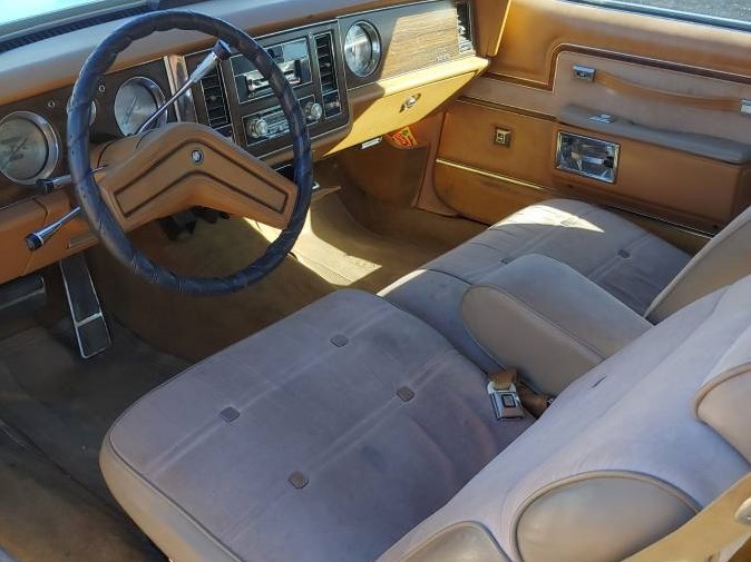 Everything on this Buick works including the cruise control, air conditioning and heater, tilt wheel, delay wipers, power windows, power driver seat, power locks, all gauges, trunk release, clock, even the 8 track radio with power antenna. The interior is original and in decent shape. There is a crack on the right side of the dash, it has a few minor stains on the seats, but not in too bad condition. The carpeting is original carpet with floor mats. There is an aftermarket steering wheel cover. It would have been unusual to see a tan interior in a blue car back in 1978, so that’s another reason this car has probably been repainted.