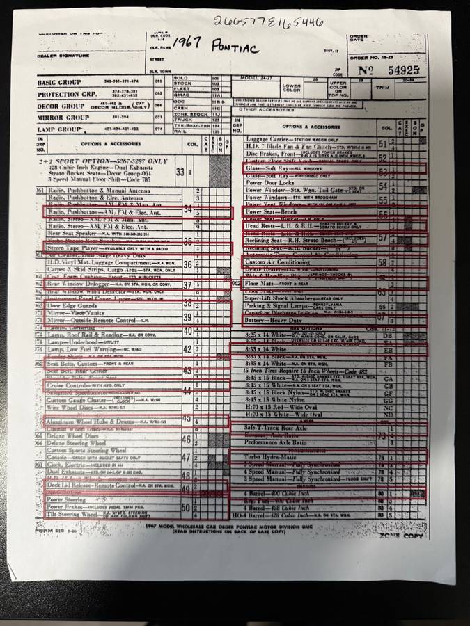 The standard Grand Prix engine was the hottest base engine in the entire full-size Pontiac line, a 350-horsepower 400. So equipped, the Grand Prix was a capable if not fire breathing ride in 1967; Car Life magazine road tested one and found it capable of a zero-to-sixty run of 9.4 seconds, and a quarter-mile time of 17.1 seconds at 83 miles per hour. That car had the base 2.73:1 axle ratio, while our very well-equipped Grand Prix has the optional 3.08:1 “Performance Axle” and Safe-T-Track. The transmission is the robust Turbo-Hydramatic 400. The PHS report tells the tale of how many options were originally ordered on this car; underhood, we can see the air-conditioning compressor, power steering, and power brakes.