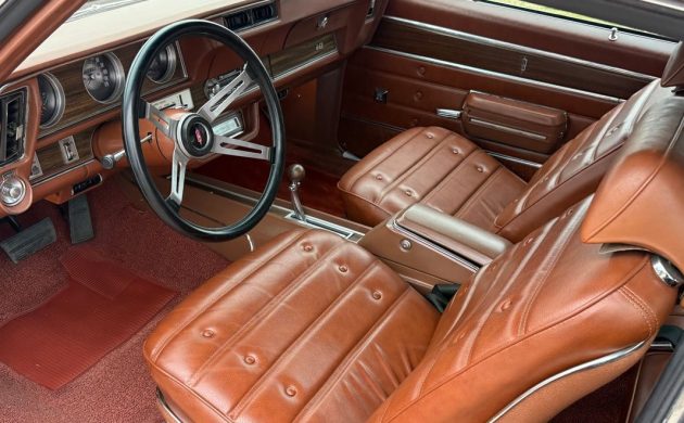 The interior looks amazing. The Pontiac GTO has long received a lot of credit for its handsome interior, but the bucket seats, console, four-spoke “custom-sport steering wheel,” elegant instrument panel, and woodgrain accents speak volumes for Oldsmobile’s interior styling department in the early 1970s. The seller says that “the majority of gauges work” and the lights and wipers “work as they should.”