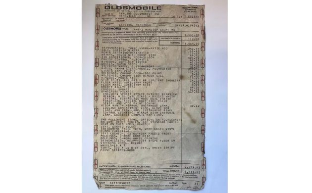The W30 gave the performance-oriented Oldsmobile buyer the “special factory-blueprinted” 455 (according to the sales materials), which produced 350 gross horsepower (300 net) and 460 gross lb.-ft. of torque (410 net) with its lower 8.5:1 compression ratio. In the case of this car, that power was escorted to the rear wheels through a Turbo Hydra-matic 400, culminating in a limited-slip differential with a 3.23:1 axle ratio (in air conditioned cars). Something to note if you’re a serious buyer: The air conditioning compressor doesn’t appear to have a belt on it.