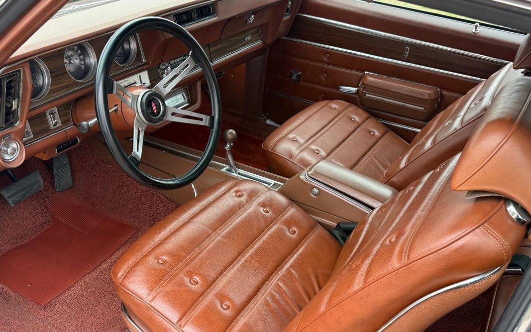 The interior looks amazing. The Pontiac GTO has long received a lot of credit for its handsome interior, but the bucket seats, console, four-spoke “custom-sport steering wheel,” elegant instrument panel, and woodgrain accents speak volumes for Oldsmobile’s interior styling department in the early 1970s. The seller says that “the majority of gauges work” and the lights and wipers “work as they should.”