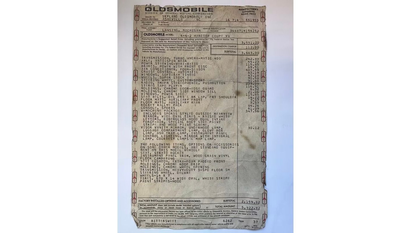 In addition to being 1 of 810 W30-equipped 4-4-2 Holiday Coupes built for 1971, this example has over $2,000 in options on its original window sticker. It has power windows, cruise control, air conditioning, AM/FM Stereo with tape player, and power front disc brakes in addition to that all-important W30 badge on the fender.
