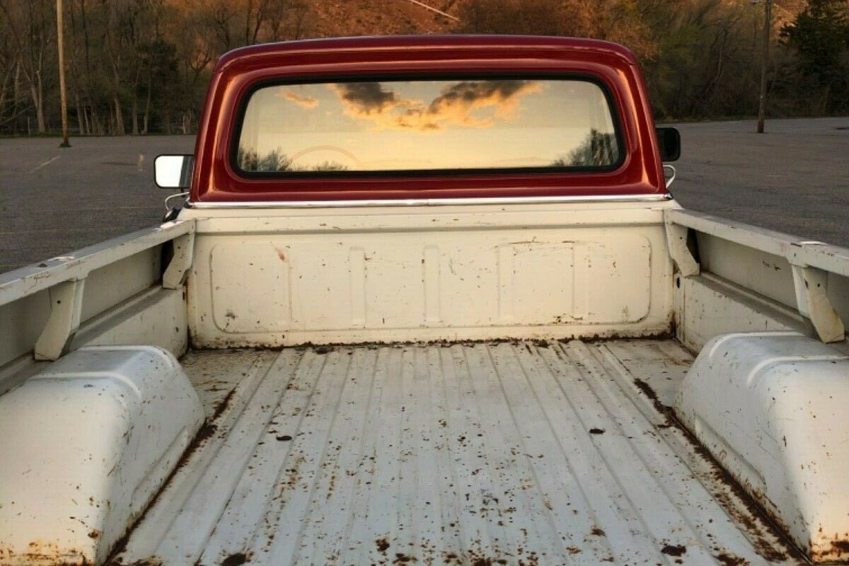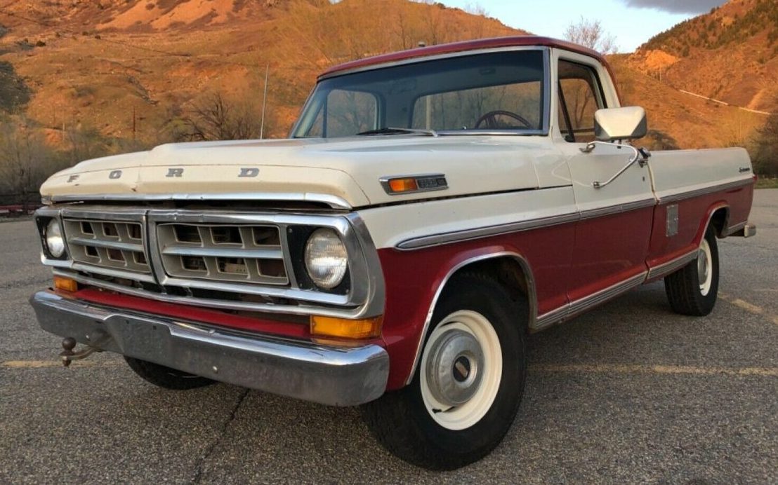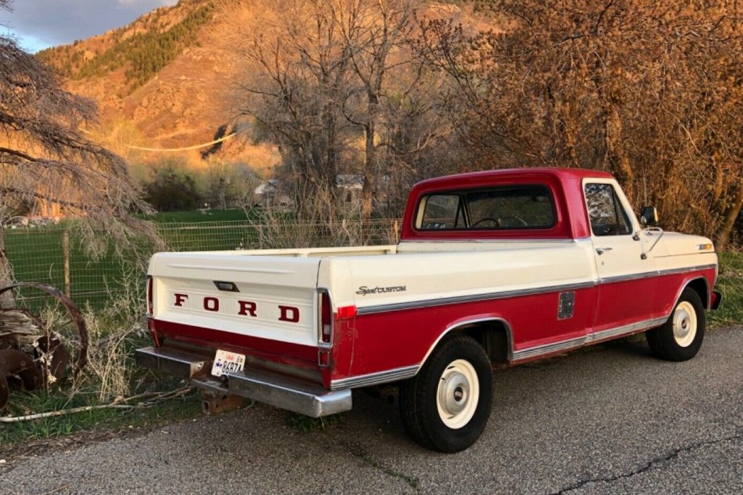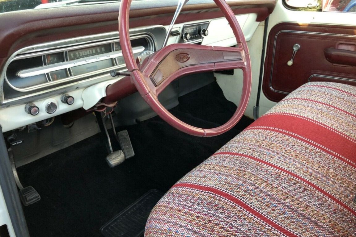 The seller claims that this truck sports the original paint and that the odometer reads 29,500 miles. The new age of digital dashboards has made the 100,000 odometer turnover question pretty much obsolete but could this fifty-year-old truck be this well-preserved and look this good after a half-century and could it have fewer than 30,000 miles on it? The truck now resides in Ogden, UT near some pretty photogenic hills and pastures. Here, the “Sport Custom” emblem in plain sight was the second in line for Ford trim packages that were, from lease to best: Custom, Sport Custom, Ranger, and Ranger XLT. The two-tone paint job was a factory choice, one of 162 paint options available for Styleside pickups offered by Ford that year.