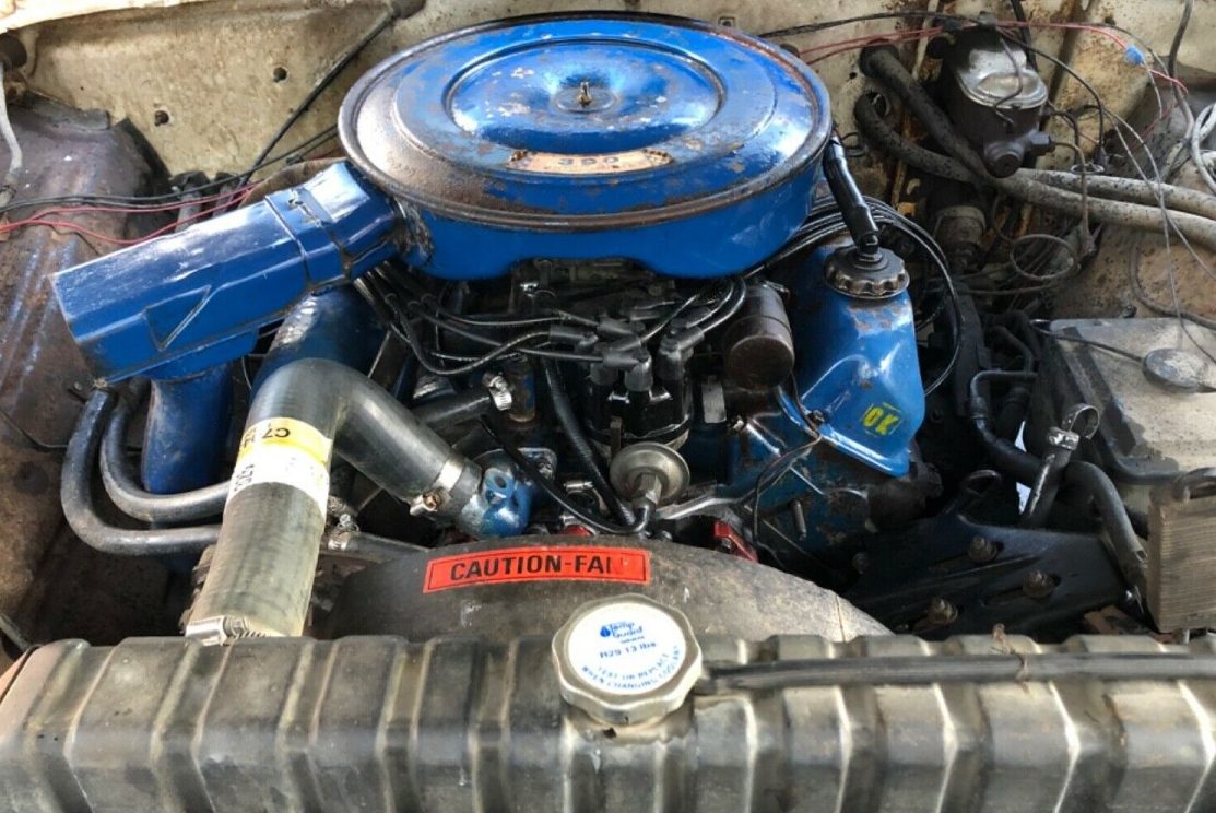 One item of contention about the truck is the VIN number “F10YRL41807” which translates to the truck coming equipped with the “Y” engine option: the 360 c.i. V8 with 8.4:1 compression, a 2 bbl carburetor, producing 215 h.p. This photo suggests otherwise, check out the label on the air cleaner–and the seller has taken the time to calculate the bore and stroke of the engine claiming that it is, instead, the “H” option, a 390 c.i. V8 mated with a Ford C-6 tranny. The seller also claims this truck has power steering and power brakes (not so sure). The truck is a 2wd model with a really sound long bed.