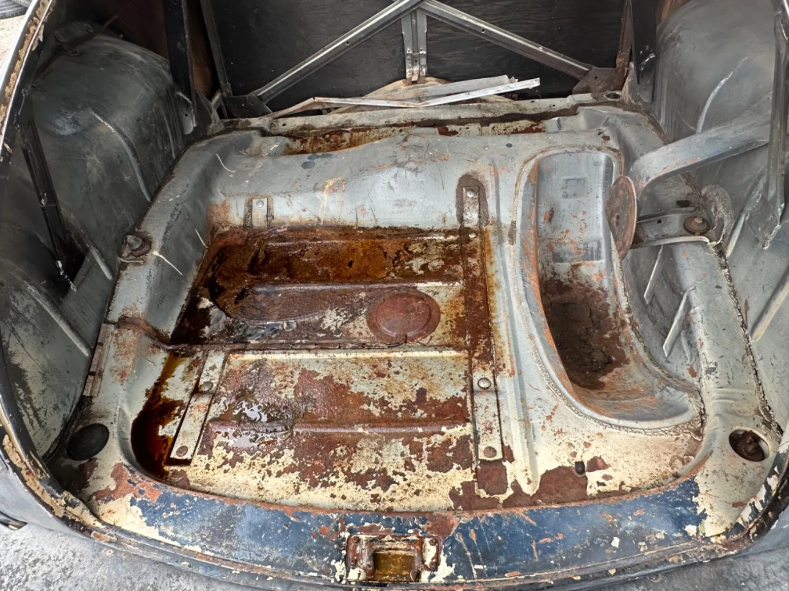 While we don’t know about the floorboards, a picture of the trunk reveals some corrosion damage. It is hard to avoid moisture in low places when the trunk seals dried up so long ago. Still, a talented body man could probably weld in some patches here and there to make the car watertight. The picture above also shows just how cavernous the trunk was on these elongated three-window coupes.