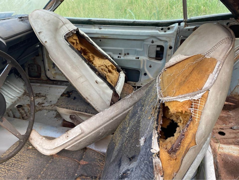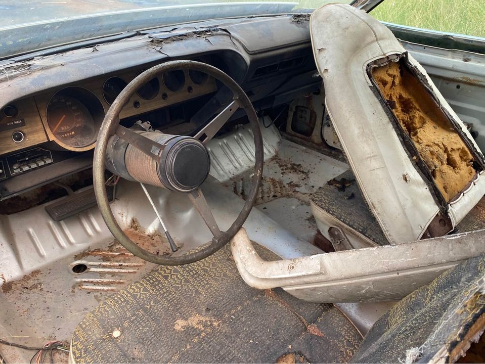 The seller portrays this car as being in Fair condition, but that may be optimistic. From the photo provided of the back seat area, it looks as though much of the trunk area has rusted away. We’re told this car came from the factory painted white with a white vinyl top and a white/black interior. The exterior of the car may have been repainted purple (Plum Crazy) at some point. Parts of the interior are missing (like the back seat and driver’s seat bottom). And the carpeting is long gone but reveals floors that don’t look bad. The door panels are nowhere to be found.
