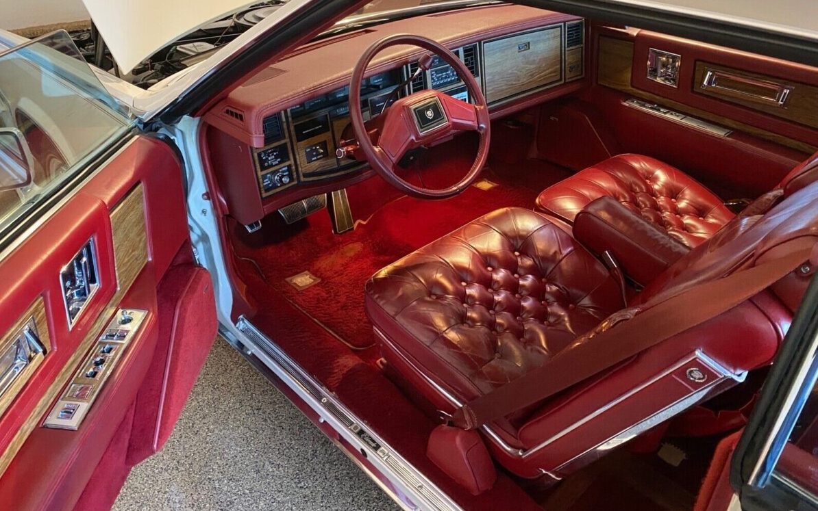 Inside is a tufted and buttoned red leather upholstery environment – standard on the Biarritz. The carpeting is “Tampico” whatever that means but it shows well with just the slightest amount of visible floor mat wear. No worries if you are of an environmentalist nature, the excessive amount of wood veneer is faux – though it probably used a lot of petrochemical input. It seems needlessly excessive – we get it, it’s a Cadillac. As for the seller’s “needs nothing” claim, I’d agree, the interior is about as perfect as you’ll find on a 38-year-old automobile with 90K miles of experience under its cushy seats. The biggest drawback is potentially getting a DWS (drivin’ while snoozin’) citation – the entire environment could be considered soporific.