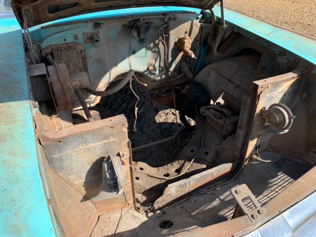 The seller is rather shy with details, however the pictures tell plenty of stories. Turquoise with white roof, most of the interior and exterior are there… missing a key component, but that wouldn’t necessarily be that big of a deal. We can see the exterior trim signs of a 210 but not a Bel-Air. I’m no expert on Tri-Fives, but I believe the 150 had the more minimalist side trim than this. Looking closely, we see three-piece bumpers fore and aft, it appears as though it was a V8 car with automatic transmission, and it also appears to have at least some rust concerns. What would you do about that?