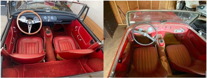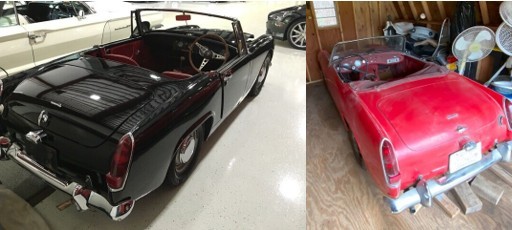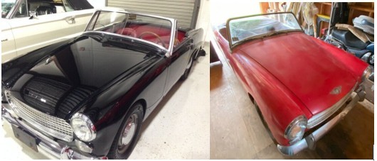The red car is said to have possibly been repainted; photos in the listing show the panels don’t match perfectly. The black car’s paint is nice, but a dent mars one fender. Very nice Sprites sell for around $20k, leaving at least a little headroom for improvements. Which Sprite would you pick as a winter project?