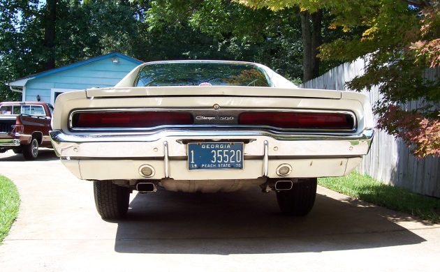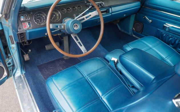 The family spent money on two main projects over the years. One, the 383 V8 has been rebuilt (when?). And, two, the exterior paint color has been changed to a lighter shade of blue than the original. No big attempts were made to hide that fact, as you can see the factory darker blue under the hood, in the doors, and in the trunk. The color shift is nice enough, but wouldn’t that detract from the value of the Charger today?