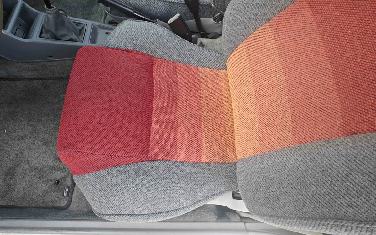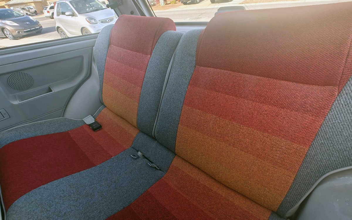 The interior looks great in this car, maybe because the seats have been recovered in NOS fabric. The dash was also removed and restored, but they say the steering wheel isn’t perfect. Here is the very cool seat fabric on the bottom of the driver’s seat, and the back seat looks like new as well. They say the air-conditioning blows cold so that’s good news.