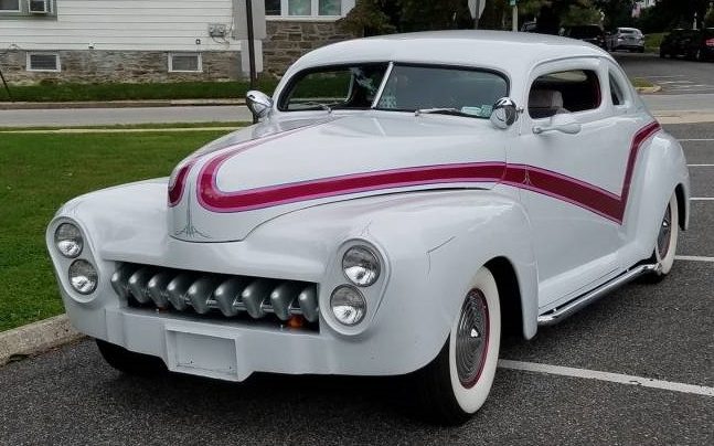 Sporting all of the classic exterior touches, like the chopped roof, Lake Pipes, ’58 Lincoln headlights, “frenched” taillights and antenna, ’54 DeSoto grille, hand-painted stripes at front and rear, dual spotlights, and wide whitewalls with moon-style hubcaps, it almost looks like it was done by Barris himself. Inside and under the hood. we see much more modern and reliable running gear, and creature comforts that many antique-owners would love to have.