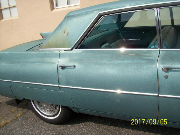 The picture above tells more of the left outside story. If you look closely, the existing paint has huge scratches in it. My guess is that the car was covered with dirt, mold, and mildew, and its rescuer worked it over with some soap, bleach, and a stiff brush. While I am sure the car looked a bit better, the rough treatment didn’t do it any favors. We can also see the rust through on the rocker panels and rusty stains creeping up from the chrome around where the roof meets the trunk and rear quarter panels. These are trademark Cadillac rust areas, and they must be addressed. Another small detail is that the wire wheel hubcaps are from a late seventies Cadillac. This is a small nit pick, but the standard hubcaps that the seller has in the trunk would look a lot better on the car.