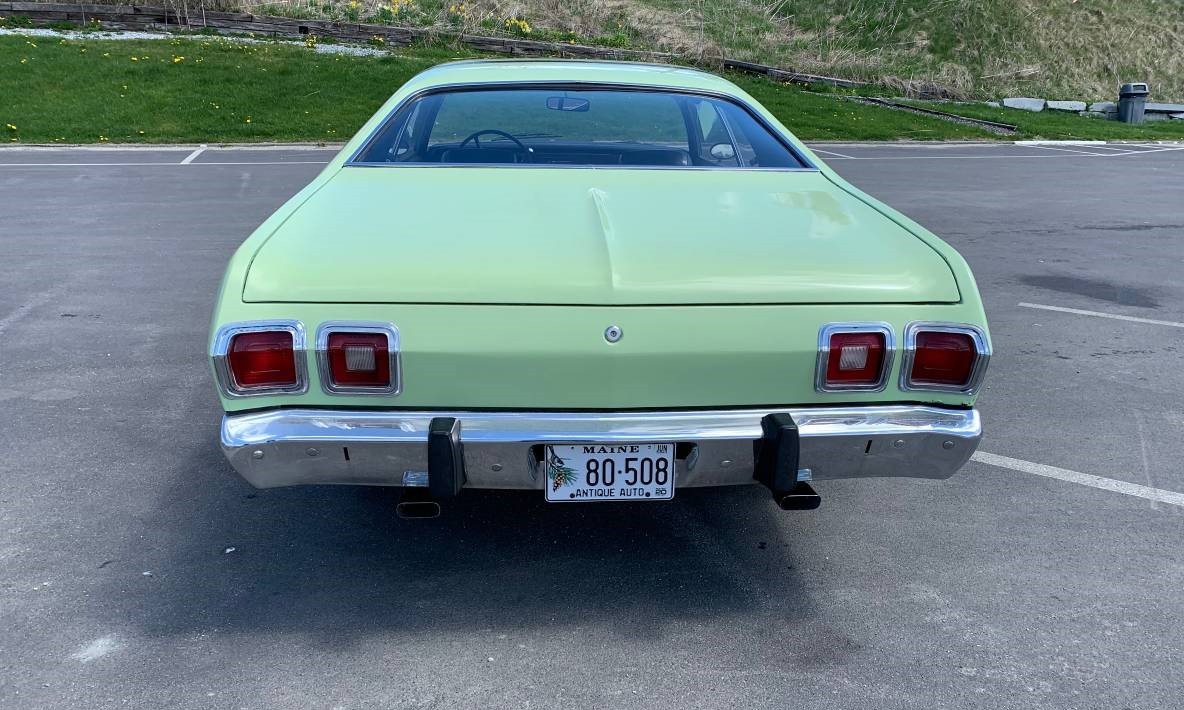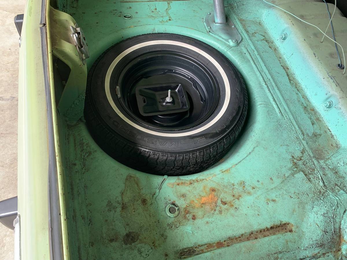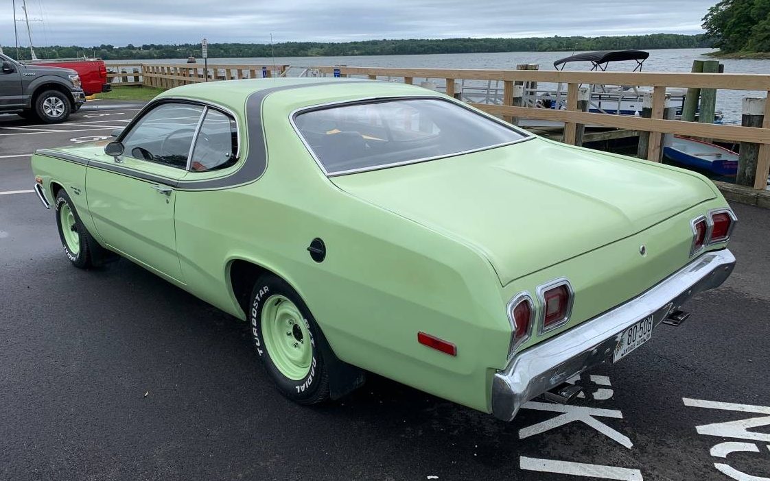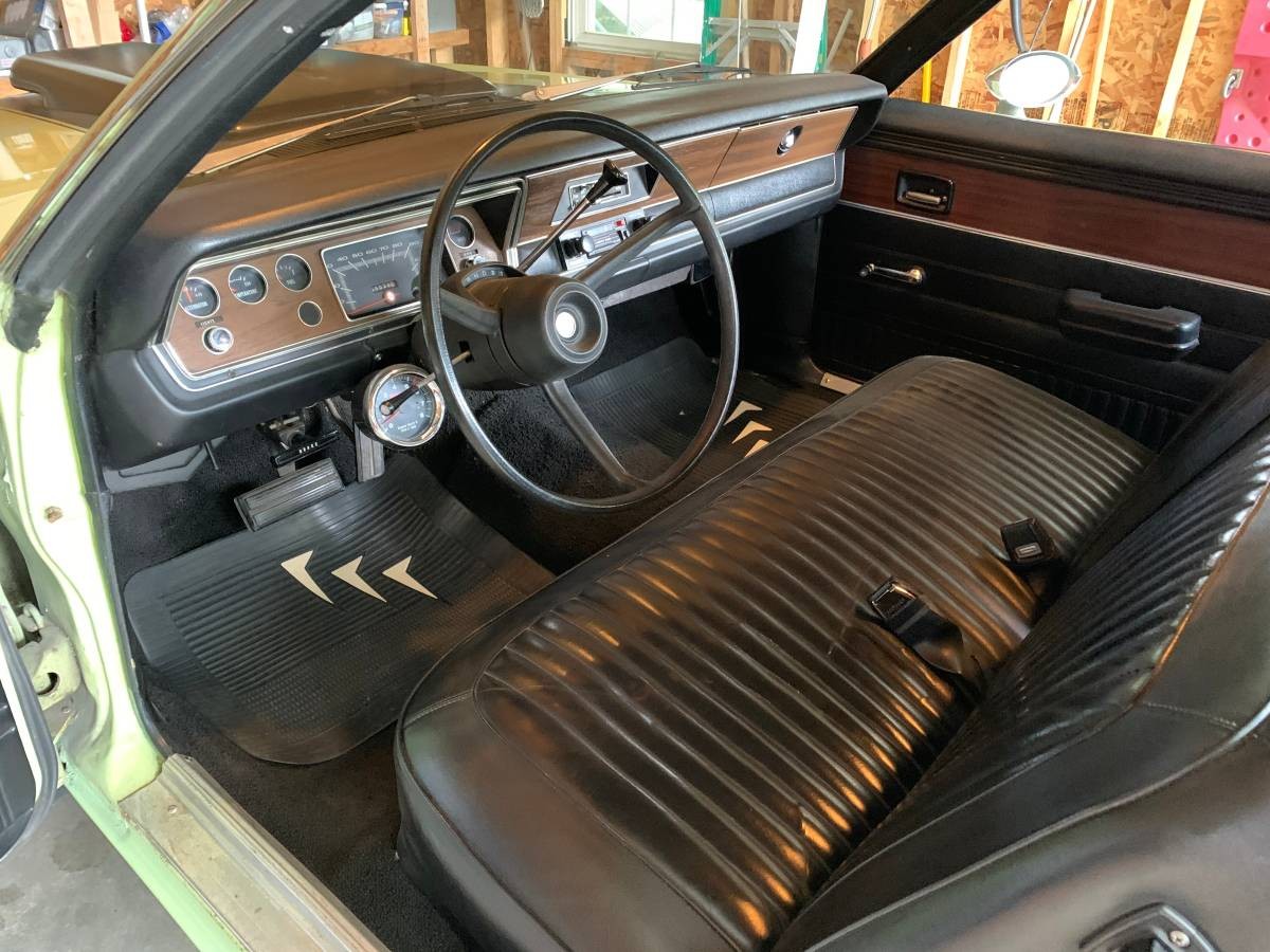I struggle a bit with the color, although it looks really great with all the black accents. The seller tells us it’s Pale Green, which was a Dodge color for 1973. But the shade on the car doesn’t quite match the paint chip for Pale Green, and the color in the floor of the trunk doesn’t match either one. But, with the back seat out, it looks like the outside. I’m probably nitpicking because this looks too nice not to be a repaint. The matching wheels work well, but the seller says a set of baby moons have been added recently.