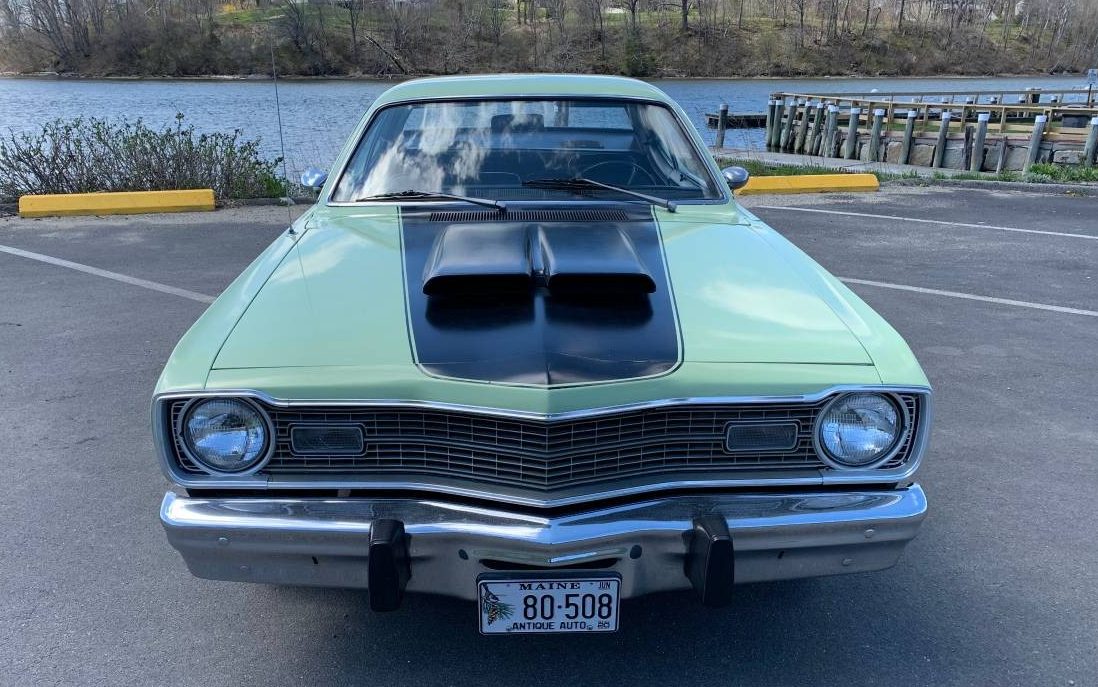 Its definitely been repainted ; you can see over spray on the weatherstrip and hood . It could be a trick of the light or camera flash, but the under hood pictures and the last picture in the garage are closer to the true color of the car. I have a 73 Duster 340 the same color , Plymouth called it ” Mist Green ” It was a one year only color ,so theres not too many around. It should have Rallye wheels on it and the air cleaner isn’t correct , but it looks to be in nice shape and not abused like so many muscle cars did