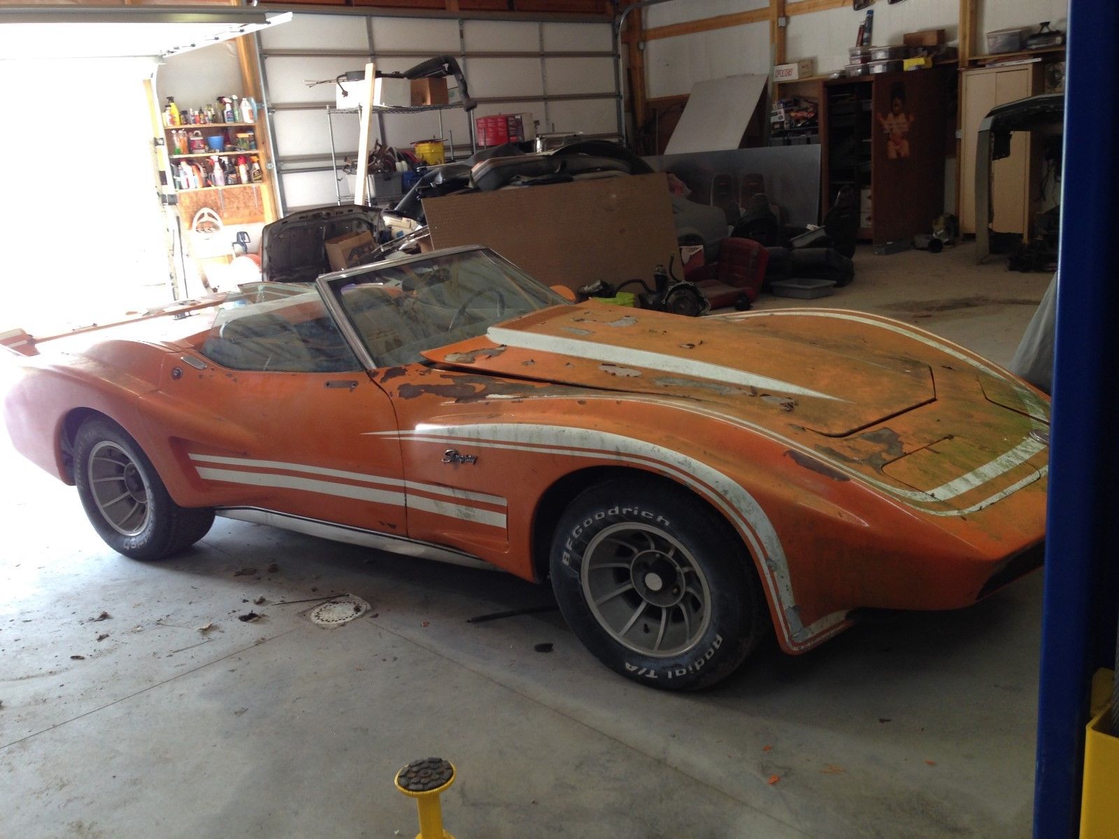 Some of you guys sure don’t know C3 Corvettes, I’d bet it is a 1969 convertible from what I see. I remember those body kits, it included the front and rear shown, and would fit 1968 on up.. I probably have a Super Chevy mag that features one just like it. If it was 1975 or so, and you bought a 69 convertible with front and rear end damage, what else to do but put a kit on it.