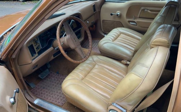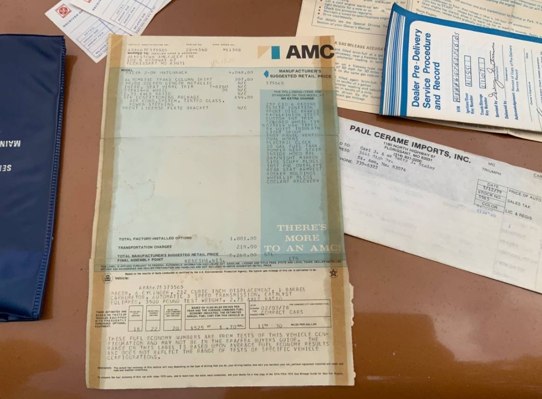 The Pacer was built from the inside out, so that four seated adults would have plenty of head-, leg-, and seat-room. Other than discolored upholstery, this interior is pretty nice! The seller notes that the headliner is in excellent condition, and photos show an uncracked dash. Occupants enjoyed easy sight lines out of all that glass, but for design reasons, the side glass did not completely retract into the doors. That’s why the Pacer’s door panels “jog” upward – to hide the still-protruding glass. The door lock buttons were relocated to the armrests. This car comes with dealer information as well as its original window sticker and manuals.