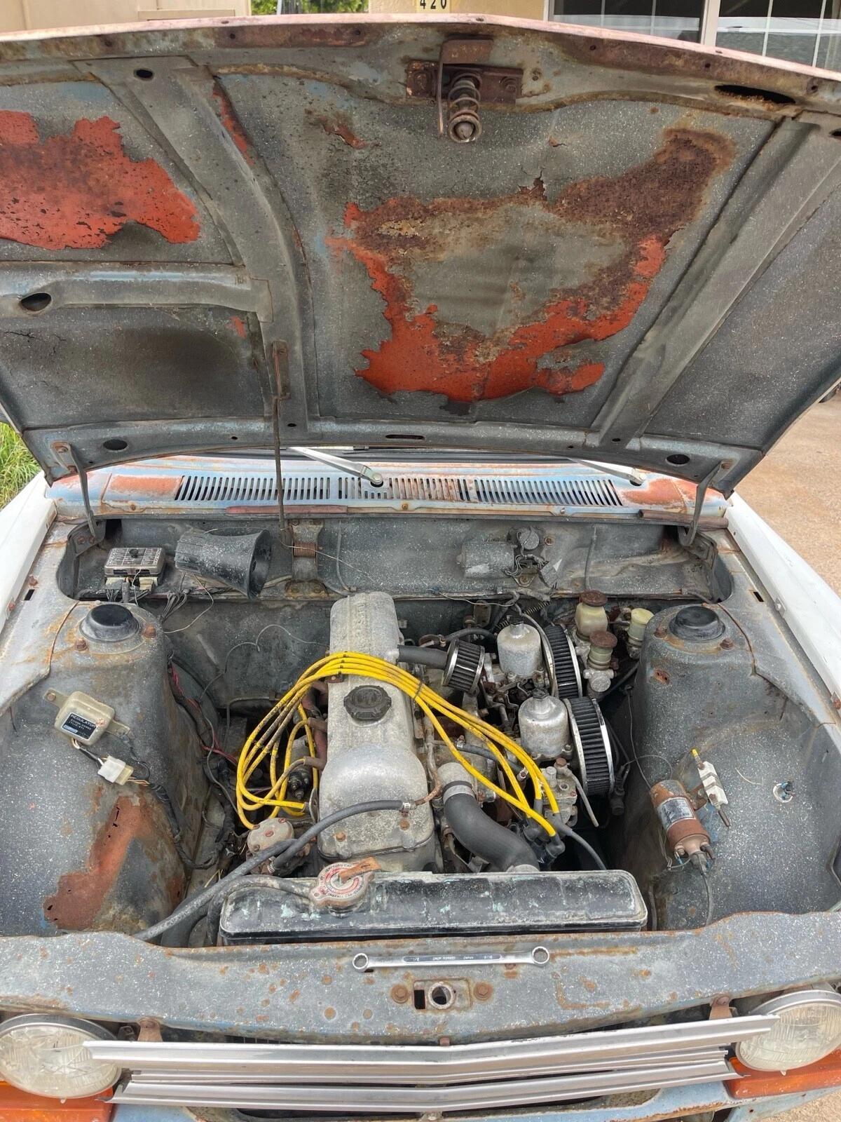 The US versions of the L16 engine were shipped here with the 2 bbl vacuum operated secondary Hitachi Carb. Japanese domestic versions had the SSS dual SU carbs that would not pass US emissions restrictions. Those engines had higher compression and a different cam profile. Can’t tell from the outside if this is just a carb conversion or the entire engine swapped in from the Japanese domestic market as those engines were imported to the US. Nonetheless, the Hatchi equipped 1971 L16 would deliver 96HP or almost 1 HP per Cubic inch which was considered a real performance standard only a few years earlier with the Corvette. These engines were very durable and much better than the Toyota 18RC of a similar time, in terms of valve and timing chain life. Plan on a head gasket change at over 100K miles as they started leaking coolant into the combustion chambers. You need to make a special tool from a wooden paint brush to jam between the timing chain both sides to keep the tensioner plunger spring from pushing the tension out of the housing. If that happens, you need to pull the front cover to fix it.