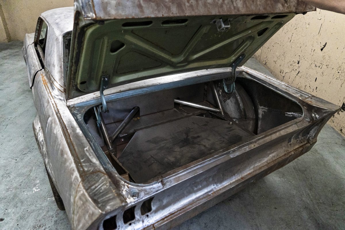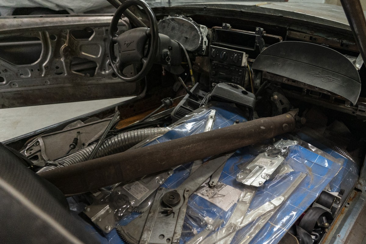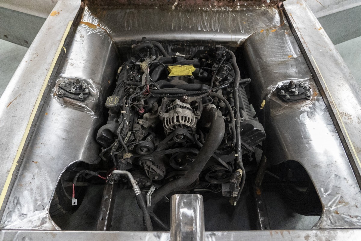 Handling was also a concern, so the entire chassis was modified to accept the newer Mustang’s front and rear suspensions, although the rear features a custom four-link system. A look underneath the car and you can see just how extensive the work done to the chassis and suspension are. Clearly, a ton of time, thought and money went into putting this all together. It also highlights how much works is left to be done.