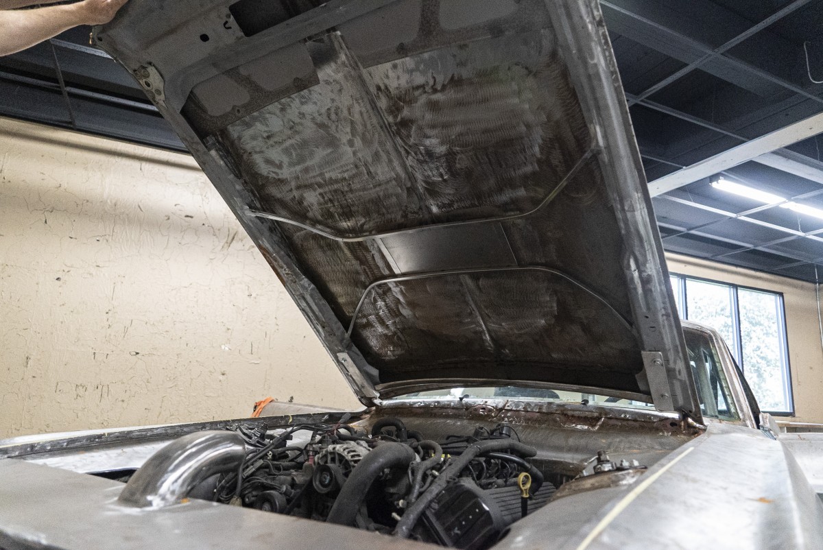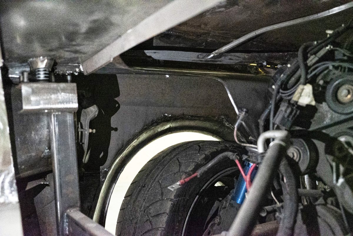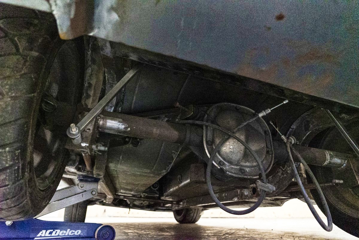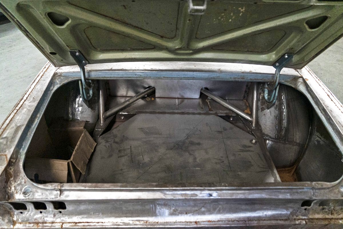 Handling was also a concern, so the entire chassis was modified to accept the newer Mustang’s front and rear suspensions, although the rear features a custom four-link system. A look underneath the car and you can see just how extensive the work done to the chassis and suspension are. Clearly, a ton of time, thought and money went into putting this all together. It also highlights how much works is left to be done.