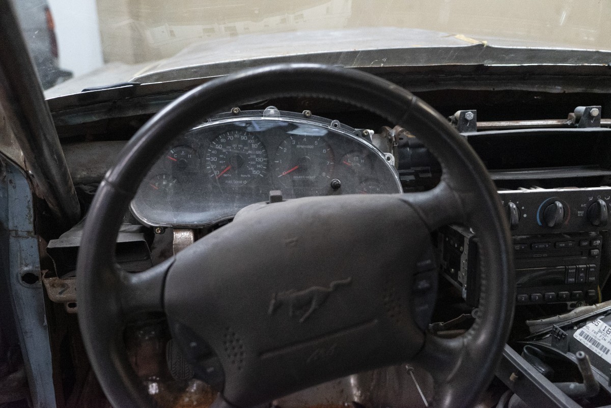 Under the hood, we find a more modern V8. It’s a 4.6-liter Modular V8 out of a 4th generation Mustang, paired to a 5-speed transmission. All of the electronics and dash were taken from the donor car as well. While the 4.6 was good for a little over 200 horsepower, it obviously wouldn’t be adequate for something like this Mustang, so a twin-turbo kit was sourced. It doesn’t appear to be installed though, so there will be plenty of work to do if you are going to go the forced induction route.