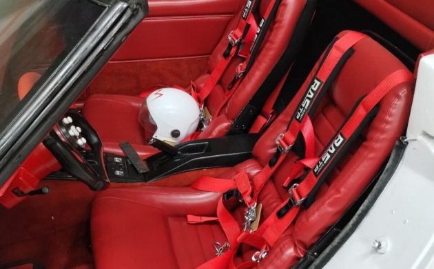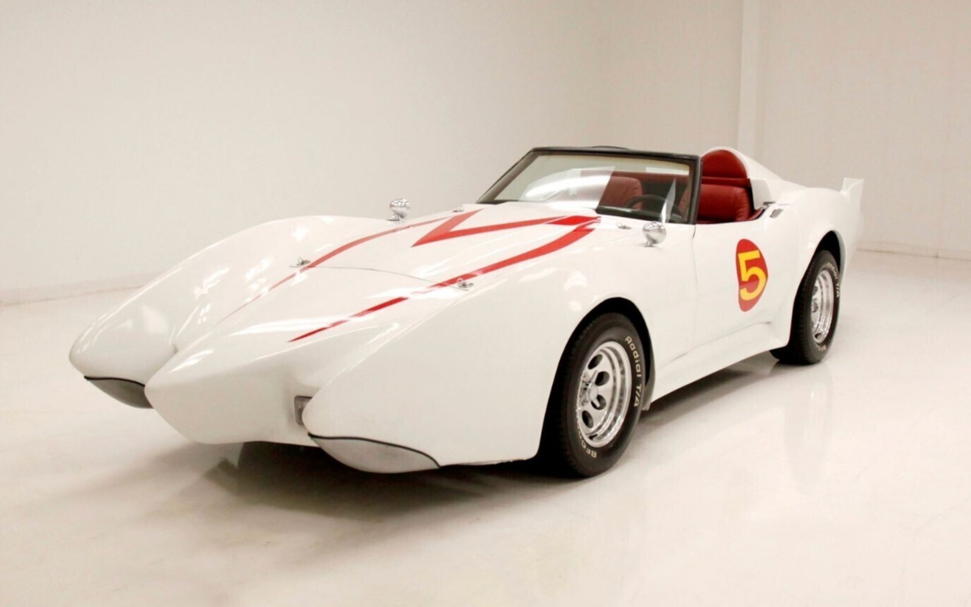 The car began life as a 1979 C3 Corvette, and according to the seller, it still uses much of its original underlying structure, including the doors, hood, and portions of the factory fenders. The rest is a collection of custom-crafted bodywork inspired by the animated Mach 5, along with pieces borrowed from various classic cars—such as early ’60s Cadillac tail fin lights. The end result is a tri-cone front end and a body painted to mimic the car from the series. That includes the stylized red “M” on the hood, the yellow “5” inside a red circle on the doors, and the white base color meant to honor the Japanese flag from the show’s fictional backdrop.