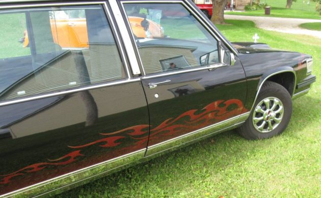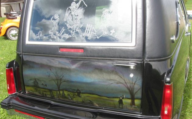 Some cars are designed to blend in, while others were clearly built to stand out. This 1988 Cadillac Hearse, offered for sale in Mayville, Wisconsin, falls firmly into the latter category. With its custom paint, glass etchings, neon underglow, and skull-themed details, this long, low machine has been transformed from somber utility vehicle into a rolling piece of automotive theater. It’s listed here on craigslist. Thanks for the tip Rocco B.!