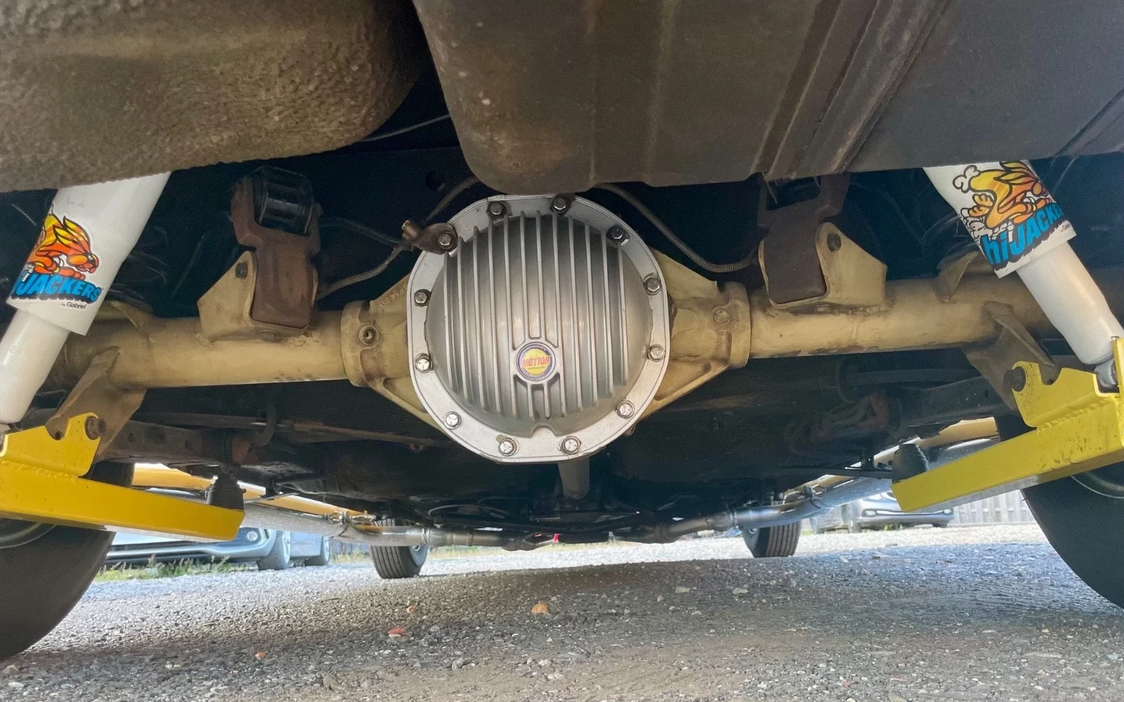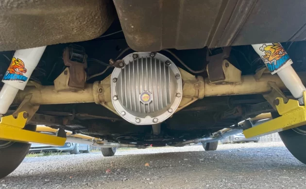 Since a tunnel-ram 350 would easily destroy a Vega’s standard differential with one good launch, a 12-bolt with 3.90:1 gears and a limited-slip differential has taken its place. The Gabriel “HiJackers” are a nice touch, as are the bright yellow traction bars. The differential cover also appears to wear a “Motion” sticker, so the builder went the extra mile to make this Vega look like it stepped right out of the mid ’70s.