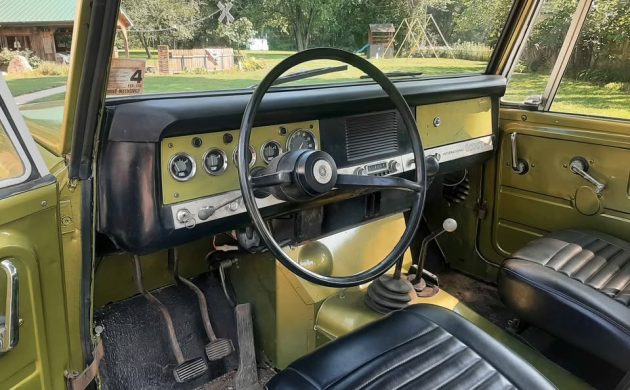 Inside, the cabin is refreshingly simple. You’ve got the low-back bucket seats and the metal dash that reminds you this vehicle was built by a company that mostly made tractors. The instrumentation on the 800A was an upgrade over the earlier 80s, featuring clearer gauges and better heating controls. Everything in the photos suggests an interior that hasn’t been messed with, right down to the original steering wheel and the twin-stick-style transfer case setup. The listing does state that this Scout has a 2″ lift kit.