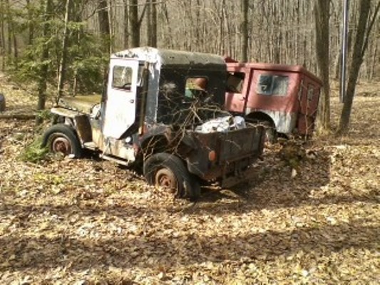 After World War II ended Willys began selling a modified version of its military MB model jeep to the public, dubbed the CJ (“Civilian Jeep”). These vehicles were widely used for just about everything and a good number of them, after having been retired from some other purpose, were converted by hunters into woods vehicles. Nowadays forgotten examples can be glimpsed abandoned on the edge of a field, tucked away in some old outbuilding, or in this case resting peacefully near an old hunting cabin deep in the Catskill Mountains of New York. Likely replaced by the modern ATV, this 1948 CJ-2A and what looks to be an early model CJ-5 appear as if they are slowly being swallowed up by the forest floor. Don’t be fooled by the pictures though. These things seem to attract the most talented tinkerers – guys with the innate ability to resurrect a famed Willys L Head “Go-Devil” engine in a very short time and with very few tools. There might be life left in these jeeps yet.