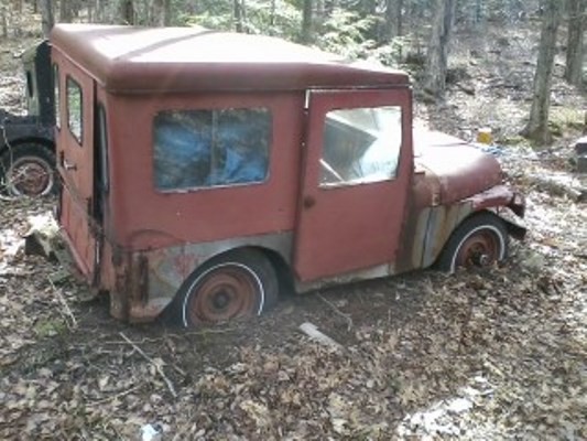 The flat-fender 2A can be identified as a ’48 by the top bow holders which are mounted just behind the passenger side rear wheel. And although hard to tell from these photos, the spare tire carrier is on the driver’s side. More info about this jeep would have been nice to have but the serial/body number number plate is mysteriously gone from the firewall. Attempts to read the body numbers stamped on the inside of the tailgate were unsuccessful due to rust and layers of old paint. Perhaps the driver’s side frame rail tag is still there? Oops…forgot to look for that. The most intriguing feature of this jeep is the aftermarket half cab which is still in one piece. The trademark split windscreen (not seen in the photos) is still present on this 2A with glass intact. The rims are of the less valuable slotted type but feature an interesting aftermarket chrome ring on the passenger side rear wheel.