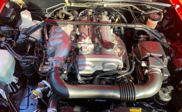 In contrast to the classic exterior vibe, the interior is considerably more up to date, with plenty of nice features, such as power windows, door locks, cruise control, and the factory Mazda entertainment system, which includes both a cassette and a CD player. The red and black seats look comfortable and inviting, and the steering wheel logo helps keep the driver aware that this one looks more like a vintage Mustang outside, to the many heads it’s sure to turn.