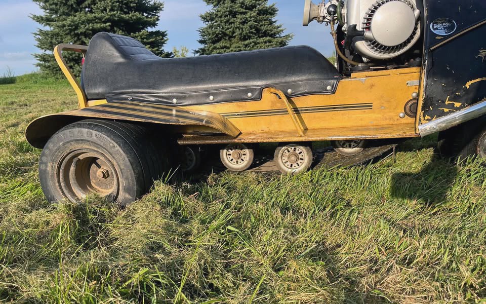 Production began in 1968 in Minneapolis as Couparral Corporation with these small, lightweight (around 150 pounds) Sno-Pony models known as the Colt, with unique front-cross leaf springs (“torsion bar ski suspension”). Eventually, things picked up when they came out with other models, and the company even held the world record for the fastest speed traveled on snow in 1970 with a rocket-powered “snowmobile”, which wasn’t really a snowmobile, sort of like Evel Knievel’s Snake River Canyon “motorcycle” jump wasn’t really on a motorcycle. This little four-season runner has nickel-plated bogie wheels for longer life than usual.