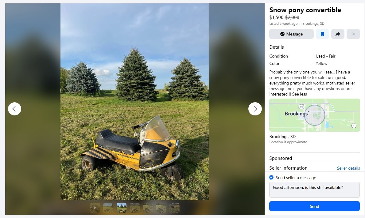 Sno-Pony had strong ties to the Twin Cities and actually sold a fair amount of sleds. They are considered modestly collectible in the Vintage Snowmobile Hobby. This one seems not out of line or at minimum a good starting price to work from.