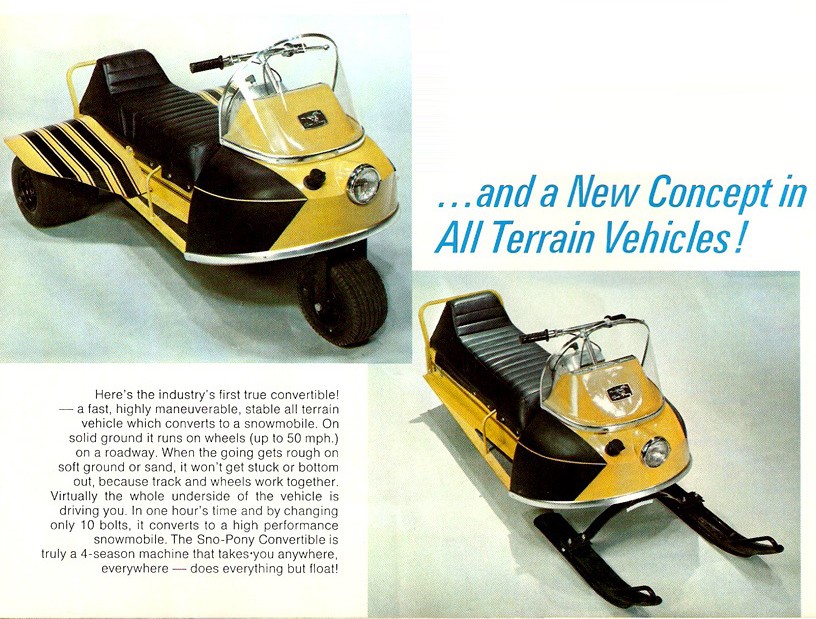 He’s back!!! YAY, and not a moment too soon. I actually remember the Sno-Pony, although had no idea where it came from. Sno-Pony was just another of the 220 some snowmobile makers, that systematically got eliminated as engineering progressed. Not many ventured in this direction, but I do remember some enterprising individuals, from Minnesoty mostly, that would create these things, and had no issues being seen on something like this. I couldn’t find a “16.5hp”, but they did have a 15 HP, a German motor I think. These so called “dual purpose” concoctions rarely work out, one side or t’other works best. Cool find, welcome back, SG!