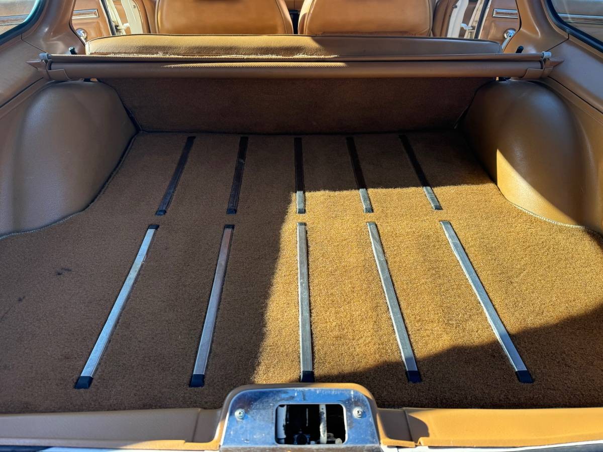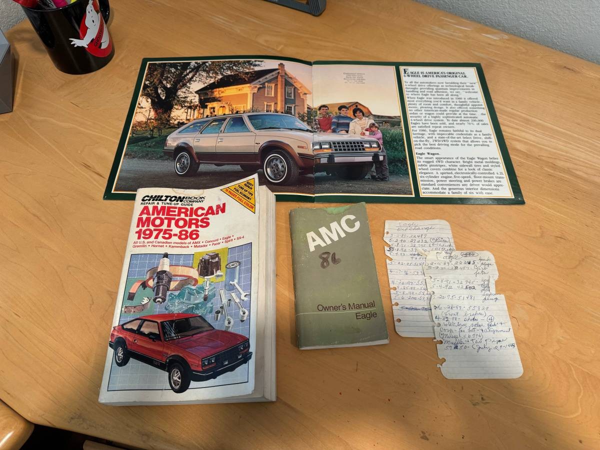 … the interior is superlative. What you may think is a crack on the dash is, I think, a reflection from the windshield. The headliner is new. The woodgrain overlay on the instrument panel is in perfect condition. The rear seats appear as if they never hosted a kid, let alone a pack of ’em. Even the retractable cargo cover looks nearly new. The carpets might benefit from a bath, but there’s literally nothing else to criticize unless you object to the aftermarket gauge hanging under the dash on the right side of the steering wheel. The car comes with a warranty notice, a shop manual, and an owner’s manual. A prior owner’s handwritten notes show oil changes, mileage, and other service events.