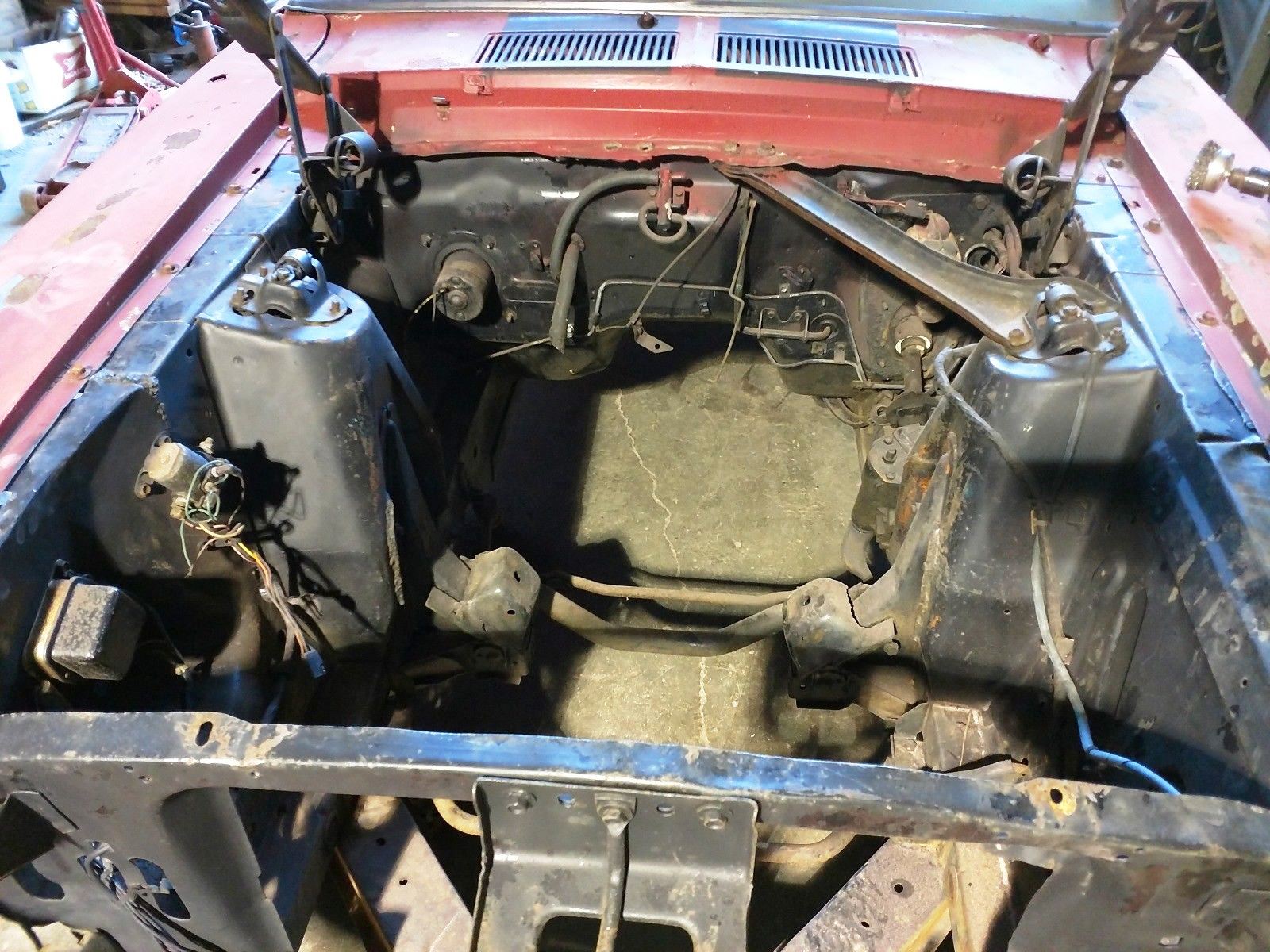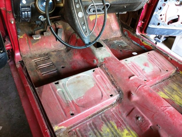 The hood and VIN plate may have come from a car that was Lime Gold, but this car sure looks like it was originally red. Who removes carpets to change colours on the floorboards of a car that subsequently gets abused like this one was?