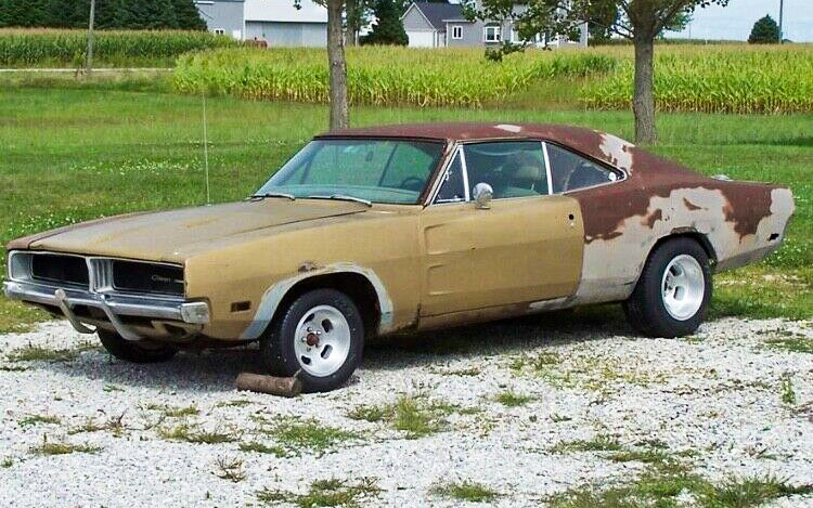 My grandparents had this car’s sibling and chassis-mate, a gold ’69 Dodge Coronet, and it’s easy to see the family resemblance to the sportier Charger. In addition to showing some of the car’s missing trim, this shot suggests the Wisconsin Tin Worm has eaten away various surfaces.