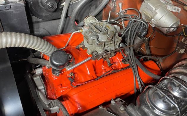 For power, this wagon is packin’ a first-year 220 gross HP, 283 CI V8 engine backed up by an automatic transmission. The seller claims that the engine is original and includes “A new milodone oil pan, a one-piece oil pan gasket, new cork valve cover gaskets, a new 7-blade fan, a new fan shroud, a new stainless fuel line from tank to new 57 fuel pump, and a correct line from pump to carb.” The automatic transmission that is backing up the small block is a Turbo-Hydramatic 700R4, a four-speed automatic overdrive unit, and a welcome swap for the original Powerglide. Looking around the engine compartment, I spy an upgraded dual circuit master cylinder – always a wise move!