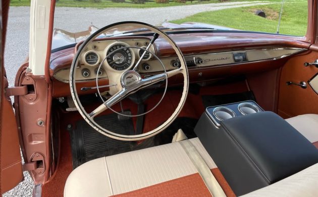 The interior is decked out in what looks like original style two-tone upholstery. Every aspect of the interior shows like new; it’s brilliant in its cheerful 1950’s presentation – so much more alive than what we find in today’s cars. The hard parts wear the same two-tone paint combination as the exterior, and it ties the environment together perfectly. Even the way back, an area often subjected to more vigorous use, is holding up its end of the bargain.