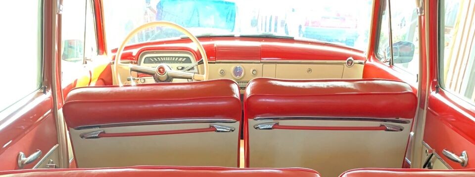 The interior is charming! The two-tone theme echoes the exterior perfectly: just look at those cool seat-back grips and that cream-colored steering wheel. These are the details we love about older cars. The seller says all the gauges work; only the clock is out of commission. The radio is original and works fine. The glass is perfect, and the car even comes with its factory key set – which works in all the locks.